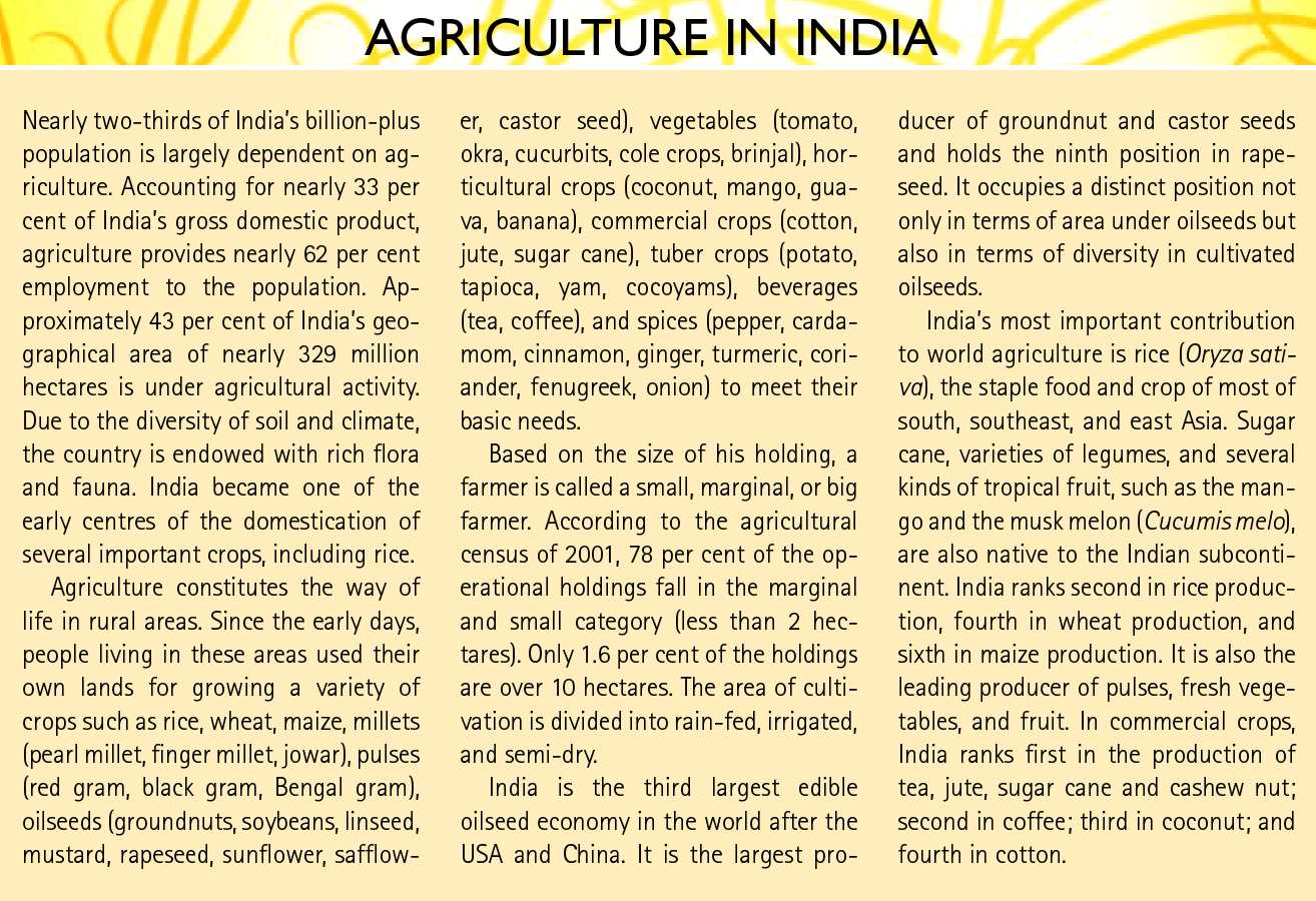 Barley ( Hordeum vulgare ), a small-seeded, six-rowed variety, and two types of wheat - club wheat ( Triticum aestivum ) and an Indian dwarf variety ( T. sphaerococcum ) - were evidently the main cereal crops, supplemented by dates, sesame, field peas, and lentils. Humped Indian cattle and a humpless breed, goats, sheep, fowl, and the elephant had been domesticated. In addition to the domestication of a great variety of animals, fragments of dyed and woven cotton fabric attest to the antiquity of the cultivation of cotton plants and of the textile industry for which India was to become famous the world over.